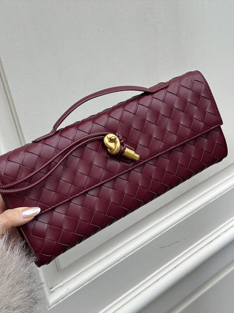 Introducing our Bianca Woven Bag, a sophisticated piece that showcases the house’s signature leather craftsmanship and meticulous attention to detail. Expertly crafted from premium vegan leather, it features a beautifully woven texture enhanced by a unique knot tie detail with a polished gold-tone toggle fastening, adding a touch of refined elegance. Its compact yet practical size is designed to fit your essentials — from your phone to a cardholder and lipstick — making it the perfect companion for events, dinners, and special occasions when you prefer to travel light. Combining timeless style with sustainable materials, the Bianca Woven Bag is a must-have accessory for the modern, eco-conscious wardrobe.